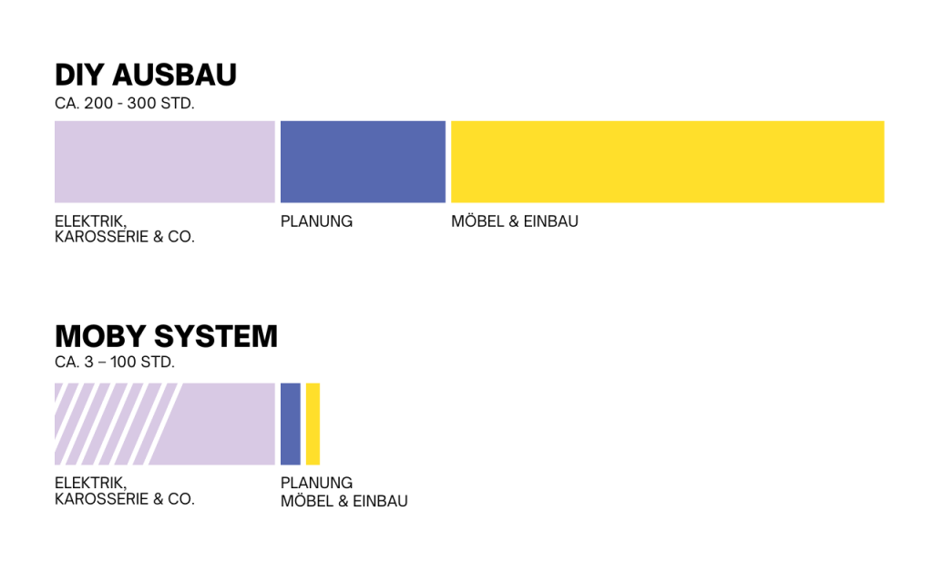 Statt deine wertvolle Zeit in den nervenaufreibenden Selbstausbau zu stecken, bist du mit dem MobySystem in kürzester Zeit startklar.